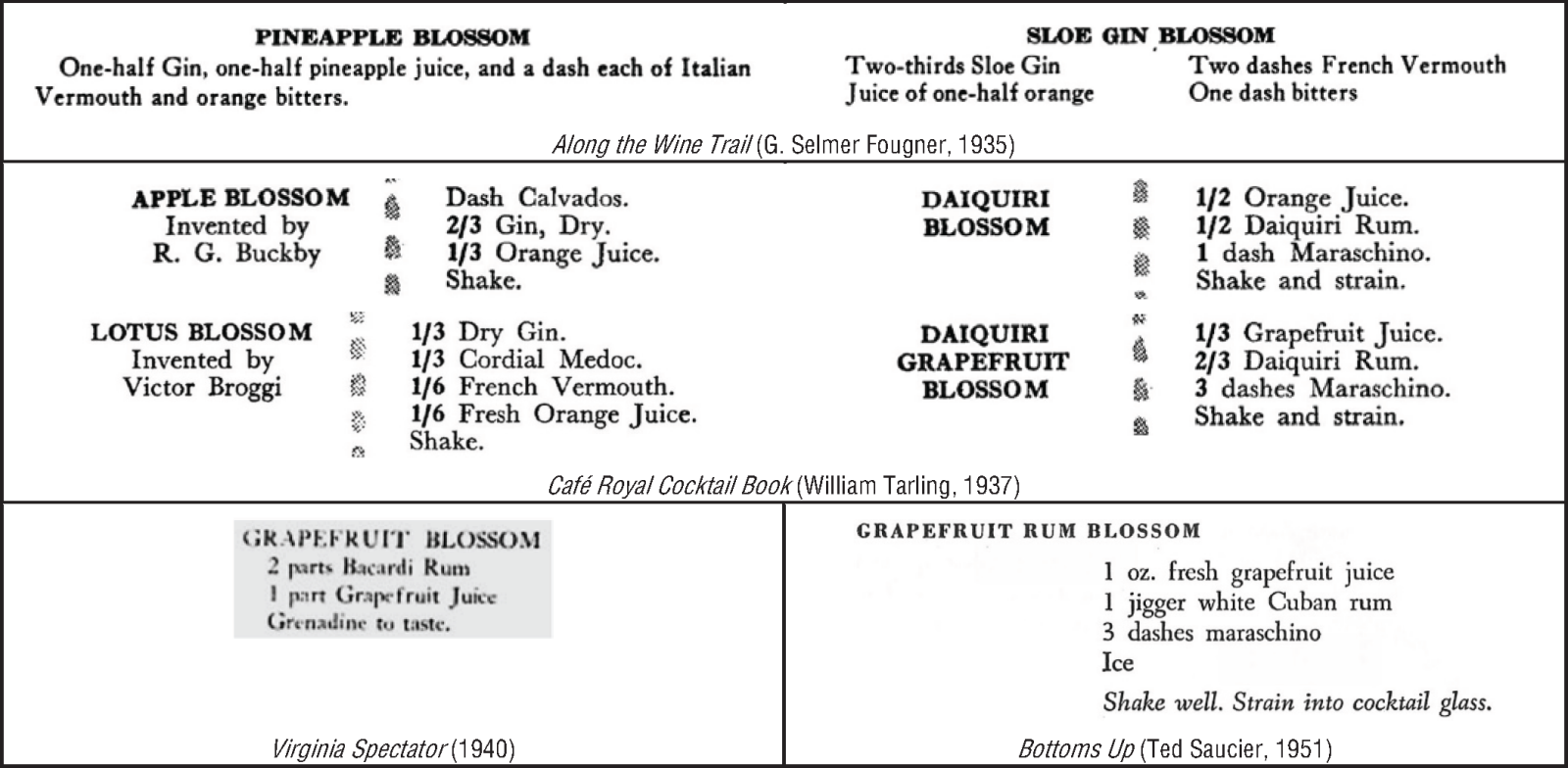 Immediately after the repeal of Prohibtion in the year 1933, sources indicate the Blossom had become a tyoe of drink, rather than an occasional moniker. During Prohibition is when that seems to have happened. Assuming that the illicit liquor served in Speakeasis was often of dubious quality, the Blossom would have been a good drink in which to obfuscate lack of quailty.
