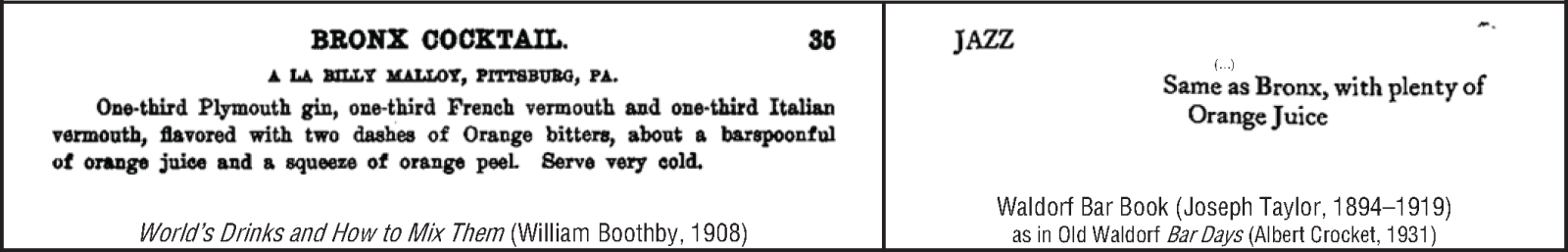 It is interesting to consider how the Bronx Cockatil, a true Cocktail, came to be a Blossom by increasing the amount of orange juice. It is most-often made made as a Blossom today, though still called a Cocktail. In the years before the onset of Prohibition, the juicy variant had its own name, the Jazz, which could be accurately extended as "Jazz Blossom."